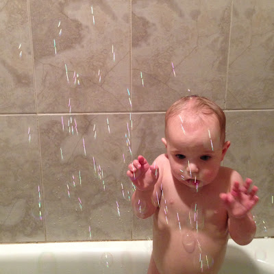 Lately, during baths, I will squirt shampoo or body wash on my hands and rub them together and say "bubbles"!! Ben seems to get a kick out of it each time, and today, he pumped soap into his hands, and rubbed them together and showed me the bubbles!