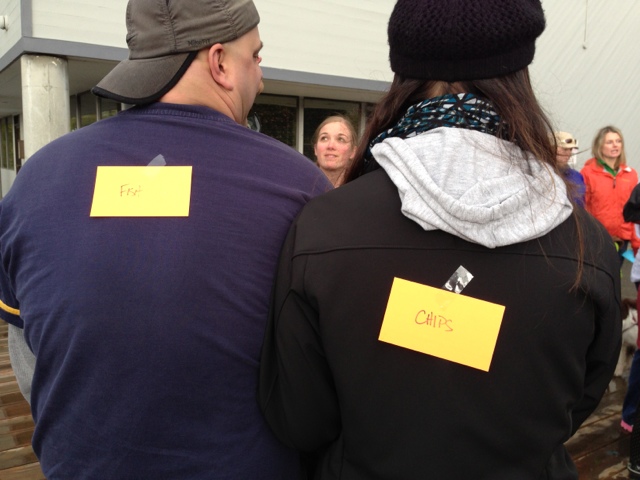 We started with an impromptu tour of their friends boat that they live on. (It's the one in the picture below to the left). It was HUGE, and awesome, and apparently some fun parties are held there during the summer! (We will definitely try to get an invite to one of them this summer) :) Next, we had introductions, followed by a quick ice-breaker game where we had to find our partner based on the cards taped to our backs. (Coincidentally, Greg and I were fish + chips - partnered up on accident). :) Some of the other funny pairings: